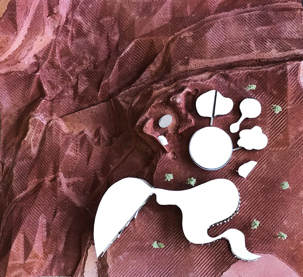On the left is a plan of the dream house. It is designed based on the circadian clock and each part of the architecture is fit within the landscape, it becomes one. The building rises from the ground and it also descends into the ground. Just like the site itself, there are ups and downs. Then on the right are diagrams that shows how the guests would go through the building and during what time.